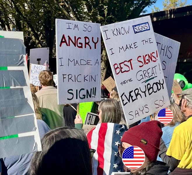 Even the man who installed his own gift shop in the Oval Office full of vanity MAGA merch claims a billionaire must have paid for seven million protest signs. Never mind that his own followers buy plenty of MAGA hats, bumper stickers, attire, and Trump-signed Bibles. Narcissists can’t comprehend that people would make sacrifices for strangers, let alone people we disagree with. But we are marching for everyone’s rights. Everyone, even our political opponents are entitled to free speech, due process, and rule of law.